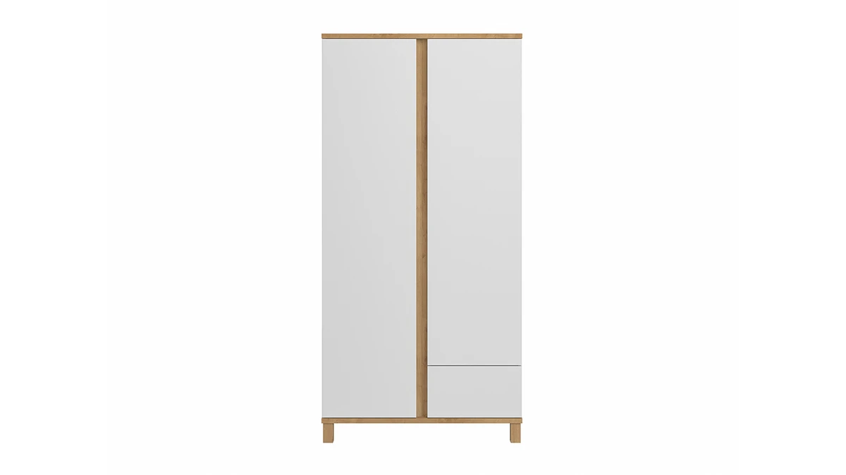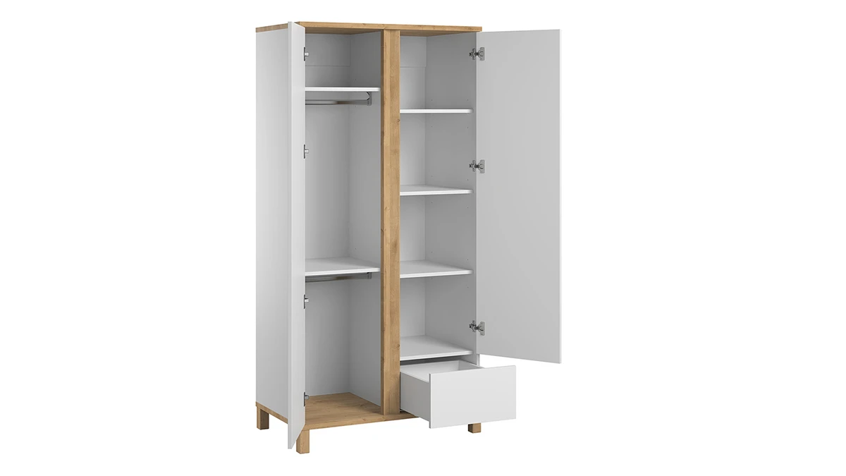 Chez EILIE, les espaces de rangement sont rois et parfaitement organisés. En ouvrant les deux portes de cette armoire scandinave, on découvre une colonne composée de quatre étagères accompagnée d’un double espace penderie et d’un tiroir. EILIE concentre tout le nécessaire pour un espace dressing parfaitement organisé… le tout dans seulement 90 cm de large ! Armoire gain de place par excellence, elle se glisse facilement dans les petites chambres.