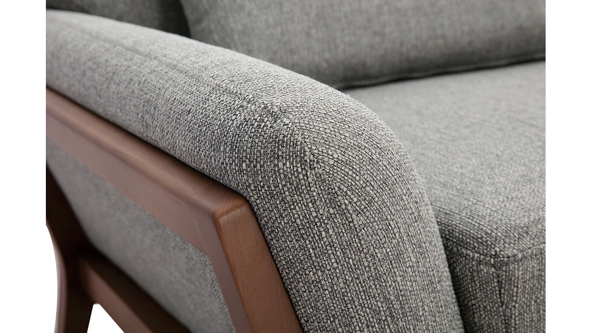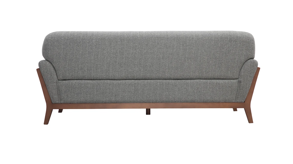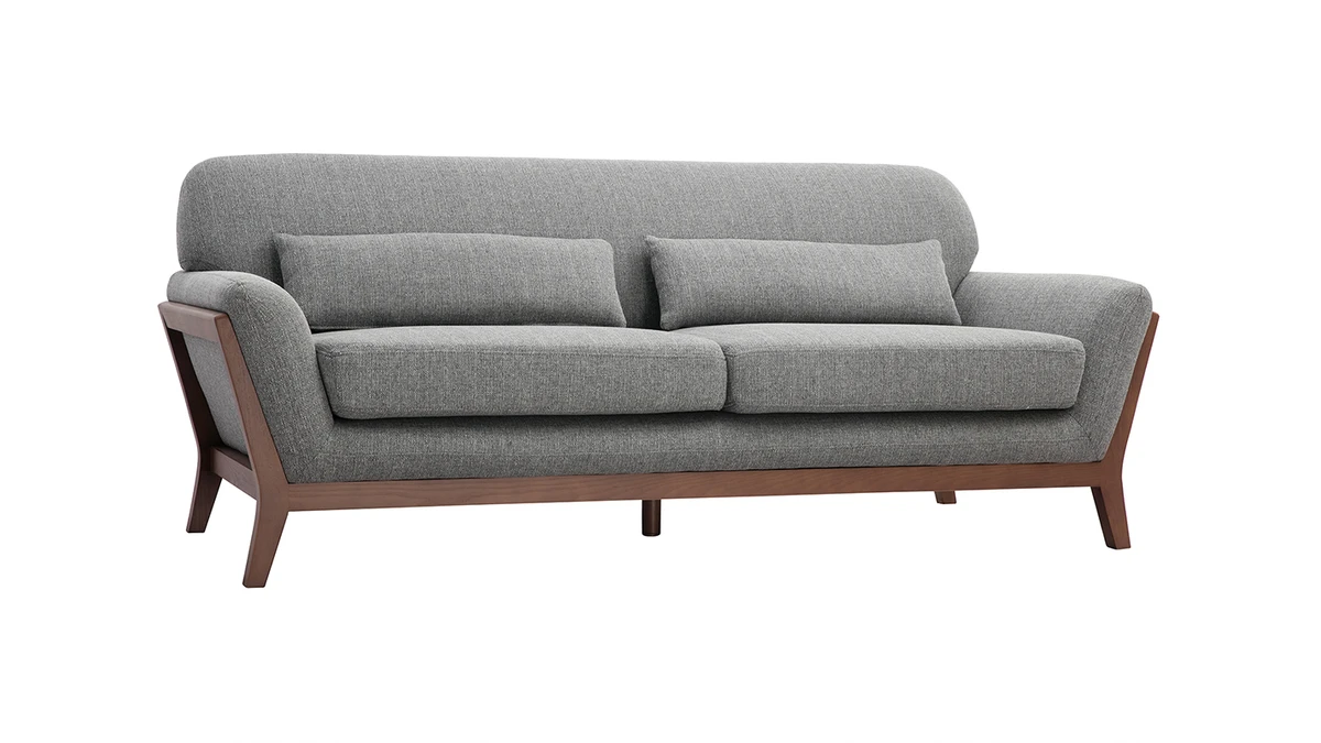 Sa structure en bois foncé se prolonge au niveau du piètement pour un rendu design et original. Avec son revêtement en polyester, ce canapé 3 places charme aussi bien au niveau des yeux qu’au toucher.