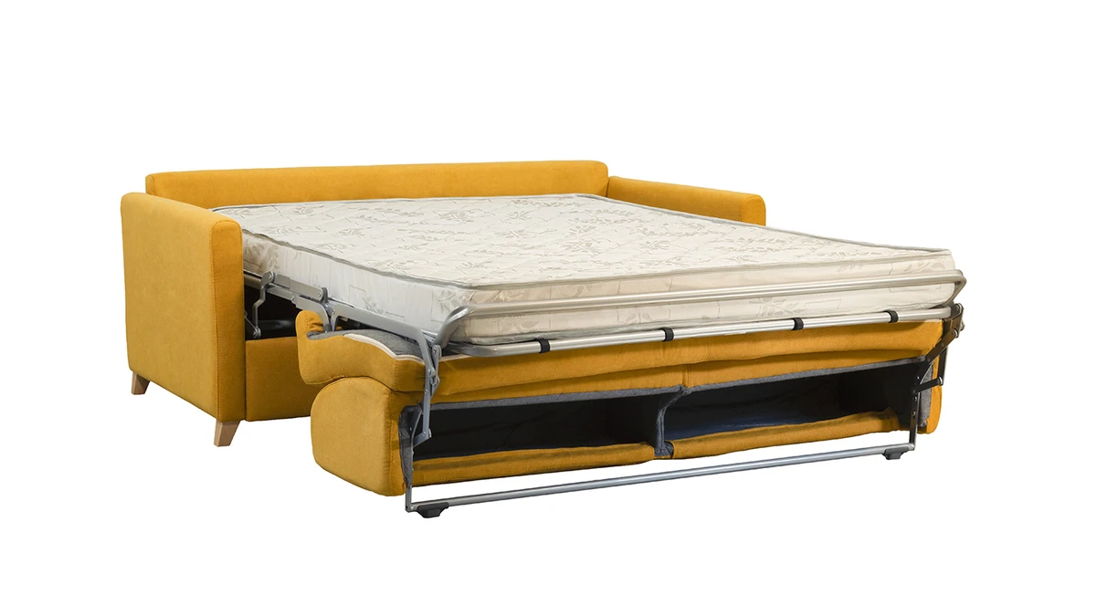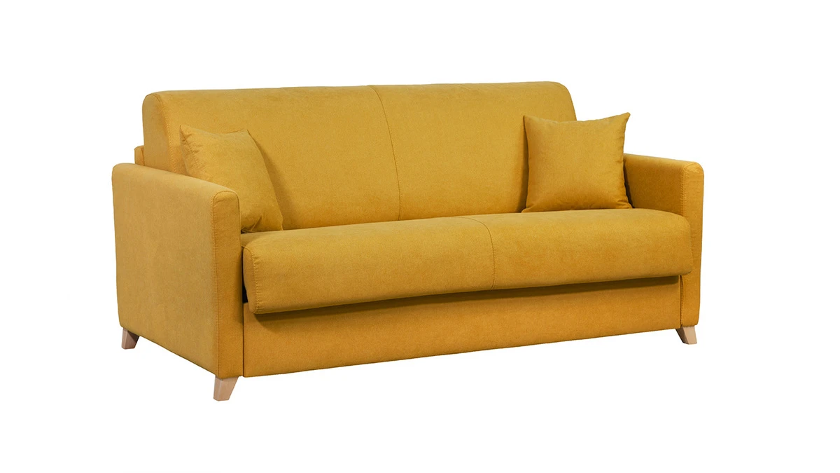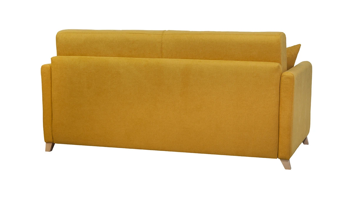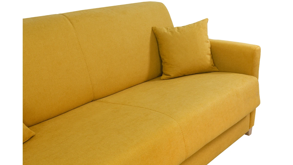 Le canapé-lit SKANDY c’est aussi un joli look scandinave et une couleur jaune vibrante qui s’associeront parfaitement à tous les intérieurs. Pour un salon naturel à l’ambiance cosy, optez pour une table basse en bois et un grand tapis berbère.