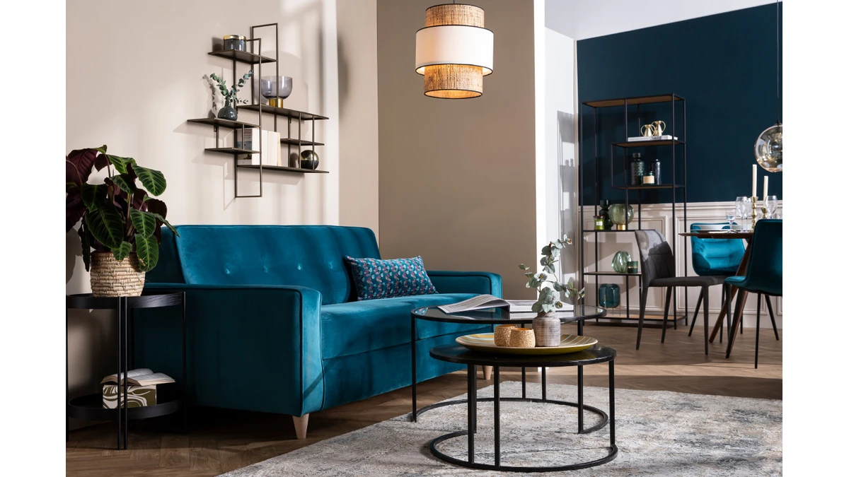 Ce sont ses lignes modernes et son revêtement qui font tout le charme de ce canapé 3 places. Le velours bleu paon est pile dans la tendance et apporte ce rendu doux et élégant qui nous plait tant. Des petits capitons sur le dossier au piètement contrastant en hévéa massif, on aime aussi tous ces petits détails qui rendent ce canapé unique.