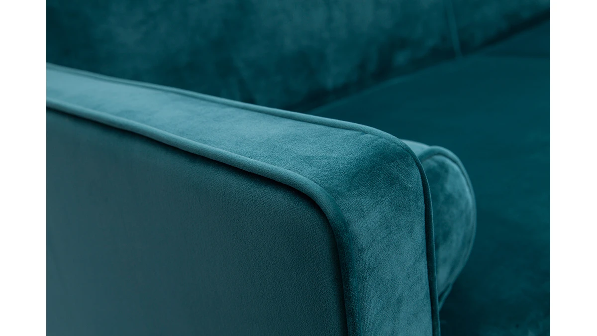 Sous son design épuré, son élégant revêtement en velours bleu pétrole et ses pieds légèrement fuselés en bois clair, se cache un canapé 3 places le jour et un confortable lit d’appoint la nuit.