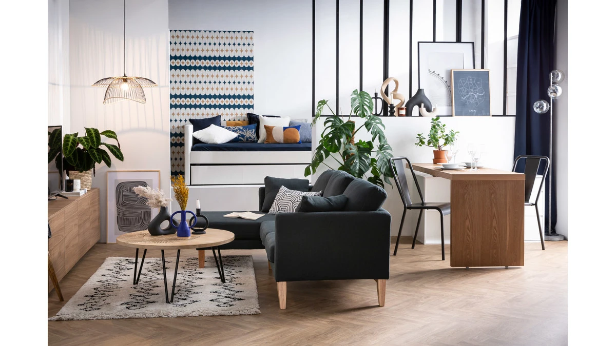 Pour un salon scandinave, vous pouvez compléter votre canapé d’angle OSLO par une table basse esprit nordique. Avec sa couleur vert lagon, il trouvera aussi facilement sa place dans des séjours plus rétro.