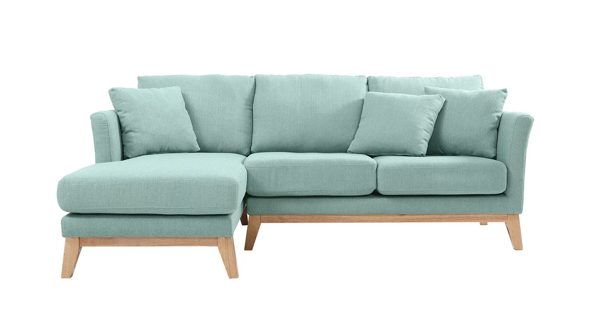 Mettez de la fraîcheur dans votre intérieur avec la jolie couleur vert lagon du canapé d’angle scandinave OSLO. Sa teinte pastel apportera douceur et élégance à votre salon et son design, une belle touche déco d’inspiration scandinave.