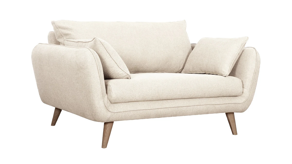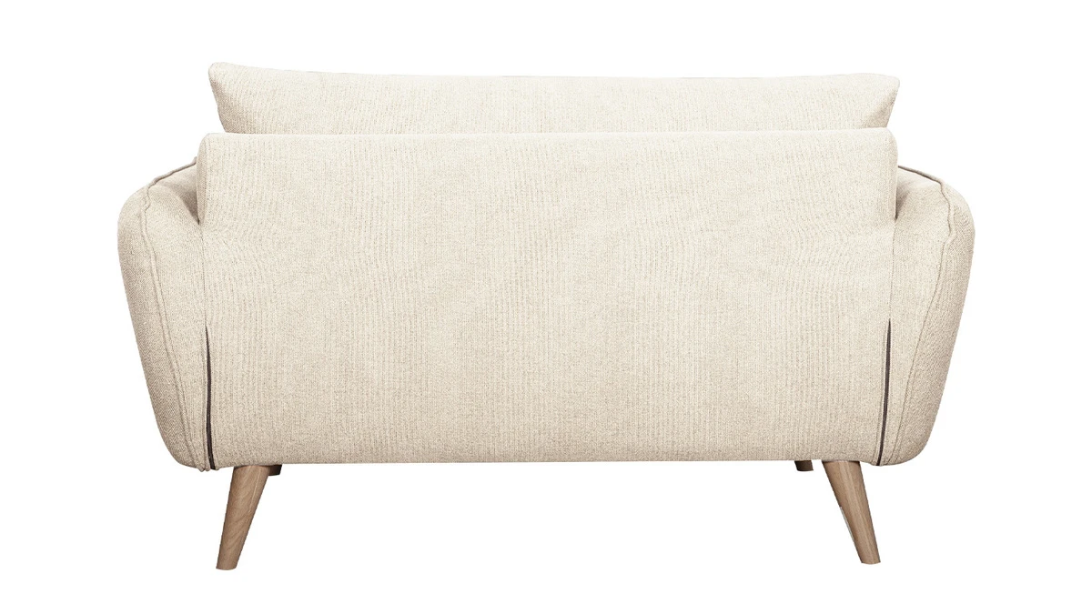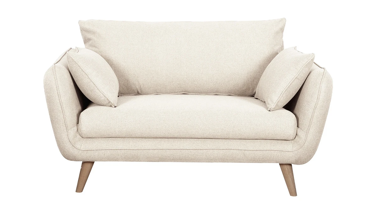Avec son design tout en courbes et ses proportions généreuses, ce canapé scandinave nous offre un confort durable. Son assise moelleuse (L107 x P60 cm) est une invitation à la relaxation tandis que son joli beige (100% polyester) nous enveloppe de douceur. Il est complété par un piètement compas en hêtre massif à la fois naturel et un brin rétro.