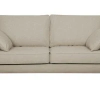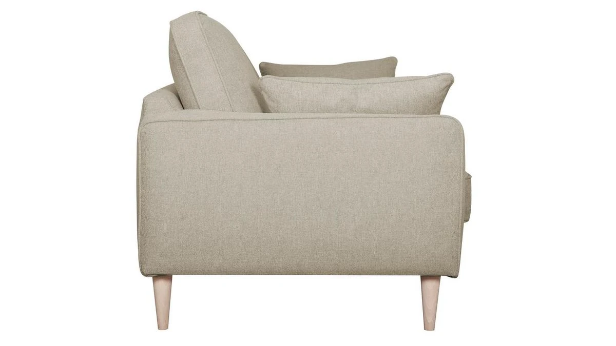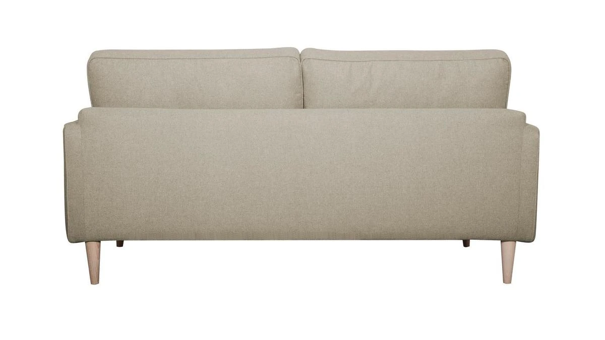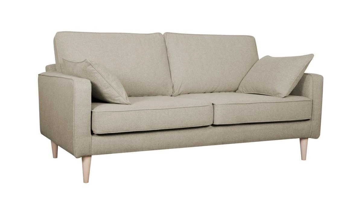 Ce canapé familial dévoile un sens du détail tout français. Il est habillé d’un élégant tissu beige 100% polyester avec des finitions soignées (surpiqûres) qui se marient à merveille aux quatre pieds en pin massif.