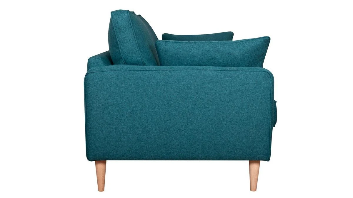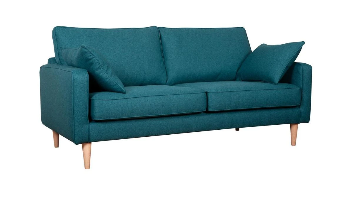 Ce canapé familial dévoile un sens du détail tout français. Il est habillé d’un élégant tissu bleu canard 100% polyester avec des finitions soignées (surpiqûres) qui se marient à merveille aux quatre pieds en pin massif.
