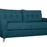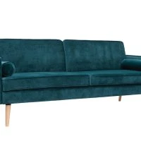 Canapé Convertible 3 Places En Tissu Velours Bleu Paon Et Bois Clair Avec Matelas 9 Cm CIGALE