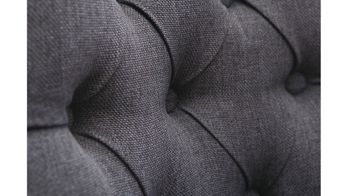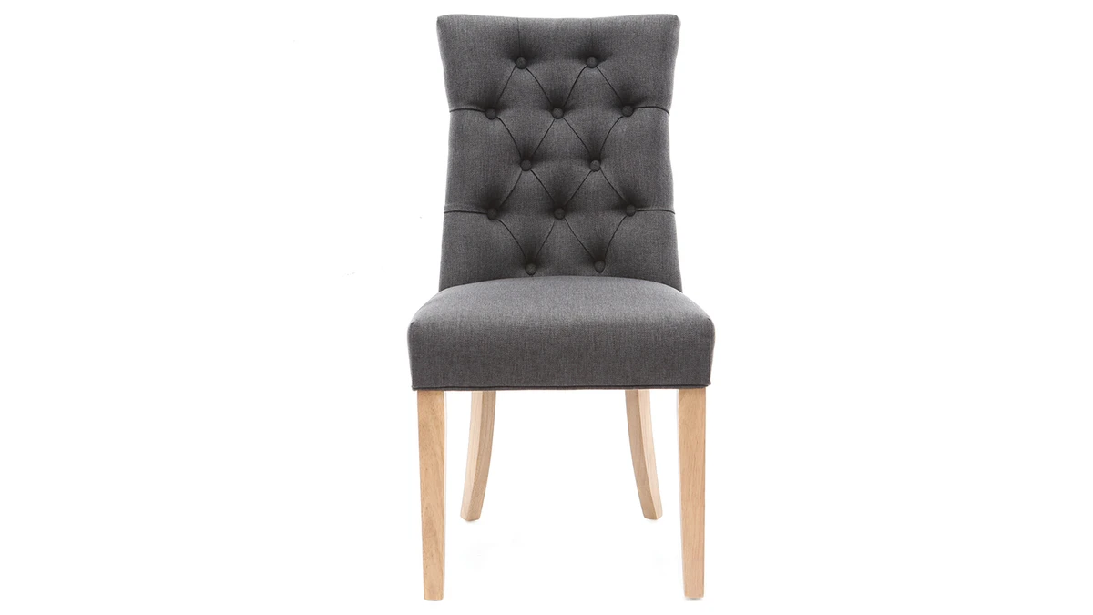Sans artifice, elle possède beaucoup d’élégance grâce à un grand dossier capitonné et des pieds en bois massif. Très agréable au toucher, son revêtement en tissu (100% polyester) coloris gris foncé apportera une touche sobre et élégante à votre pièce de vie. Son dossier épouse parfaitement les courbes du dos pour un excellent maintien. Ses pieds, à l’arrière, sont inclinés et arrondis pour donner une touche unique à ces chaises tout en volumes !