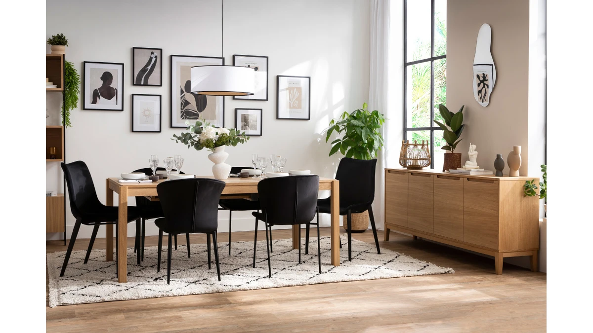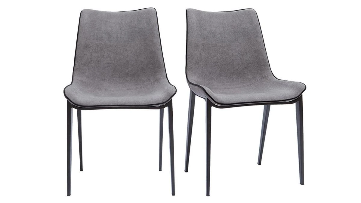 Avec leur assise large et incurvée (L50 x P39 cm), ces chaises rembourrées garantissent un maximum de confort. Prenez place au coeur de leur forme enveloppante et laissez-vous surprendre par la douceur de leur revêtement, un tissu effet velours gris (100% polyester). On aime particulièrement le biais noir qui souligne la silhouette. Leur dossier haut et courbé sera aussi un véritable allié lors des interminables repas de famille. Le piètement en métal noir s’équilibre parfaitement avec l’assise. Il apporte une grande légèreté visuelle tout en offrant une bonne stabilité. Assise et piètement fusionnent dans une harmonie parfaite.