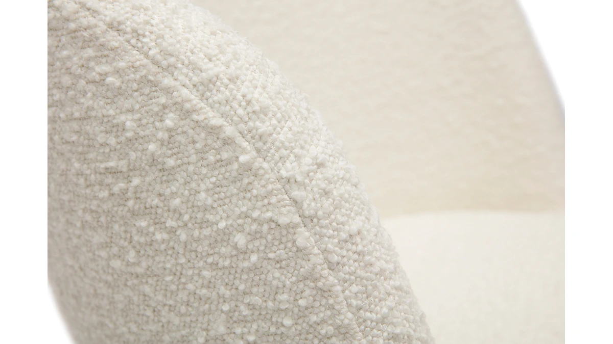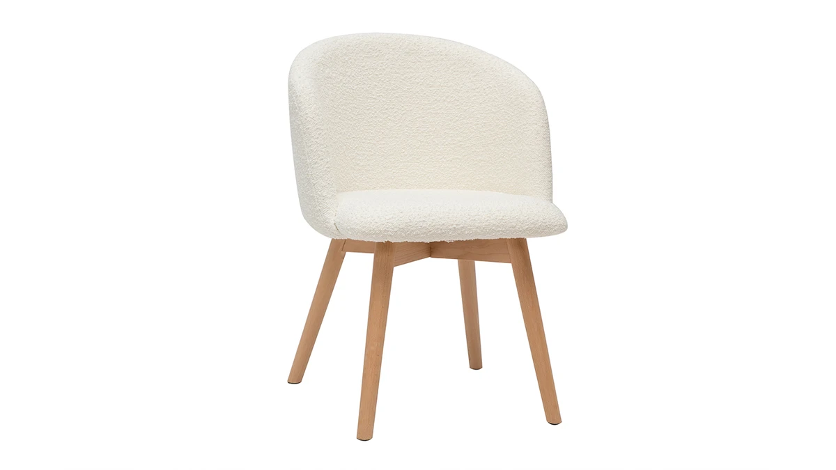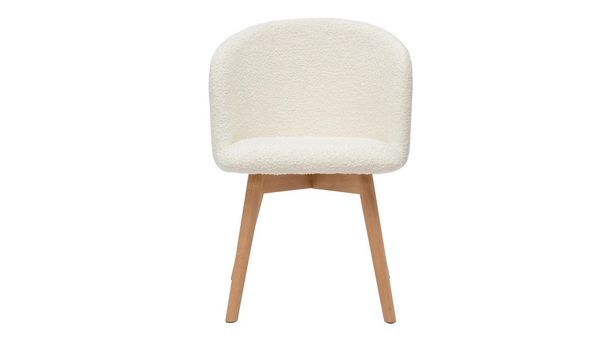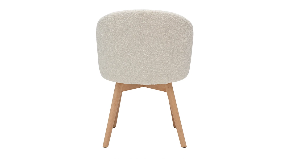 Avec leurs formes généreuses et leurs pieds en bois blond (hêtre massif), les chaises VANITY font écho à la tendance Hygge qui célèbre un art de vivre chaleureux et authentique. Leur revêtement effet laine bouclée nous transporte dans un monde de douceur. Leur dossier enveloppant (L56 x H39 cm) forme comme un rempart et leur assise moelleuse (densité de la mousse 25 kg/m3) est propice à de longues soirées de détente autour d’un bon repas.
