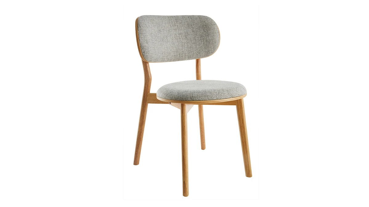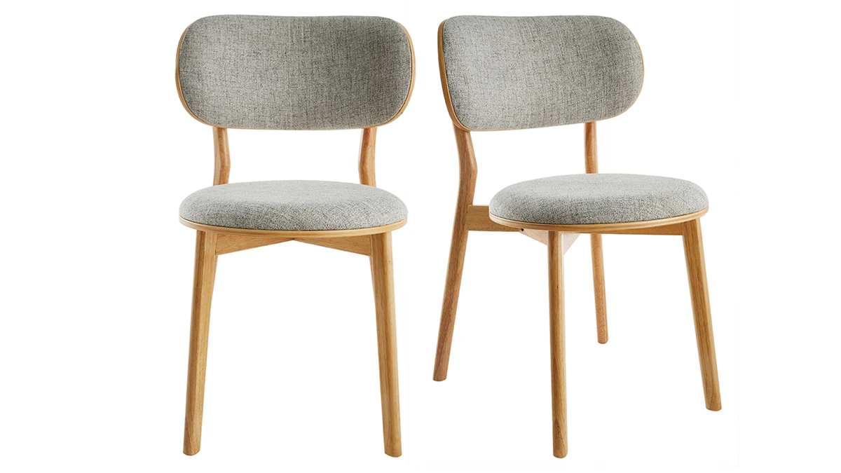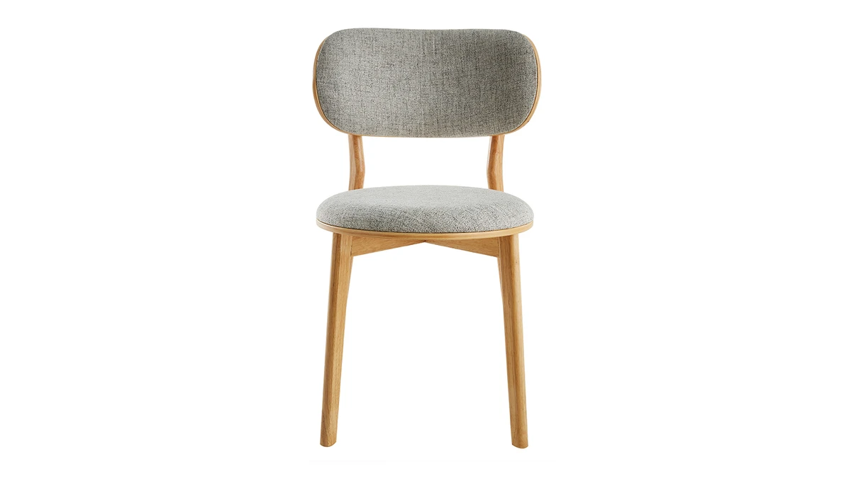 Avec leur délicate saveur vintage, ces chaises en tissu gris et bois clair s’intègrent tout naturellement dans les intérieurs en quête d’authenticité. On aime le contraste entre le charme rustique d’une structure en bois clair (placage frêne), avec ses noeuds, ses veines marquées ainsi que ses douces nuances dorées et la modernité d’un tissu gris (100% polyester).