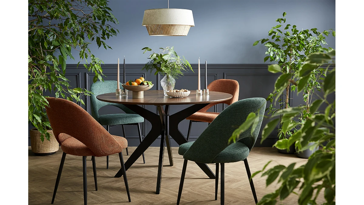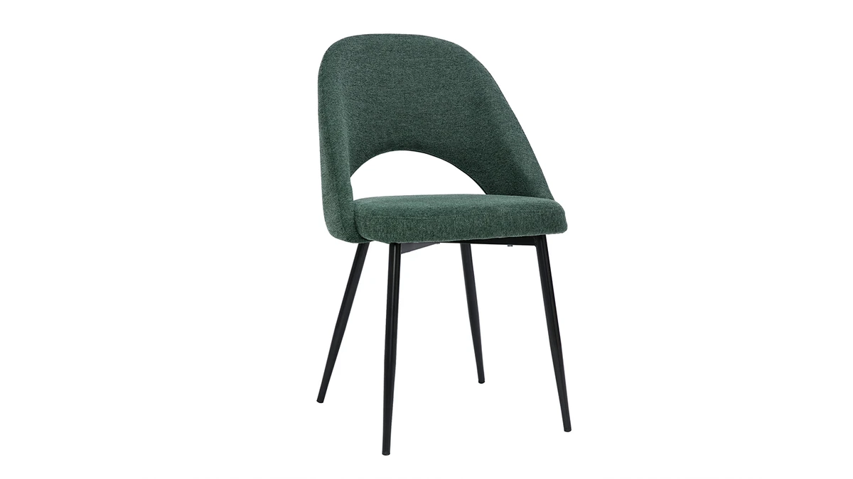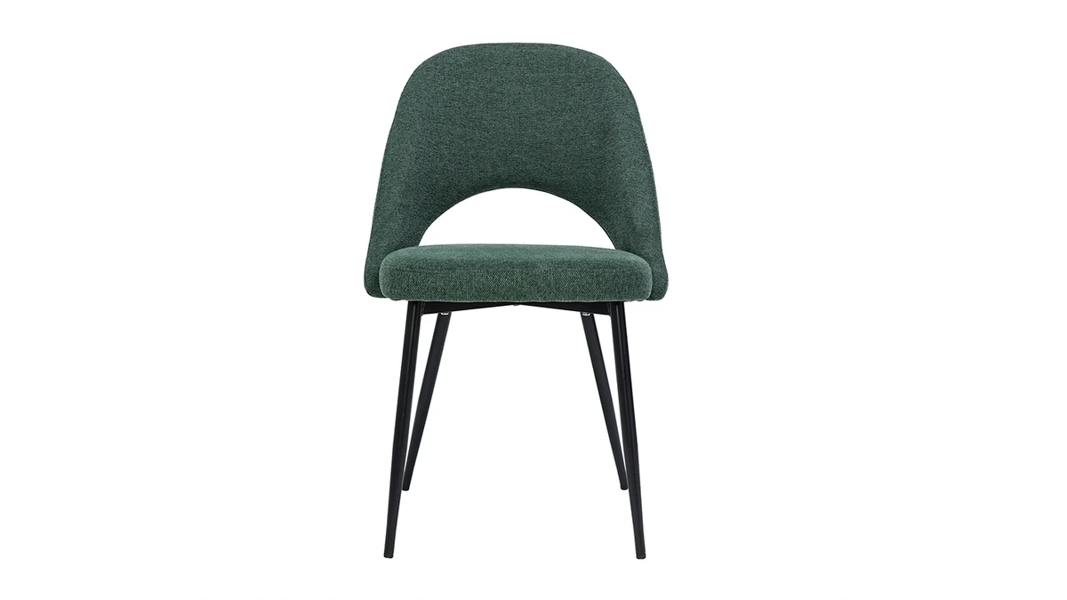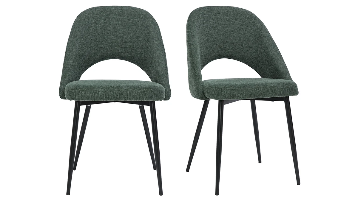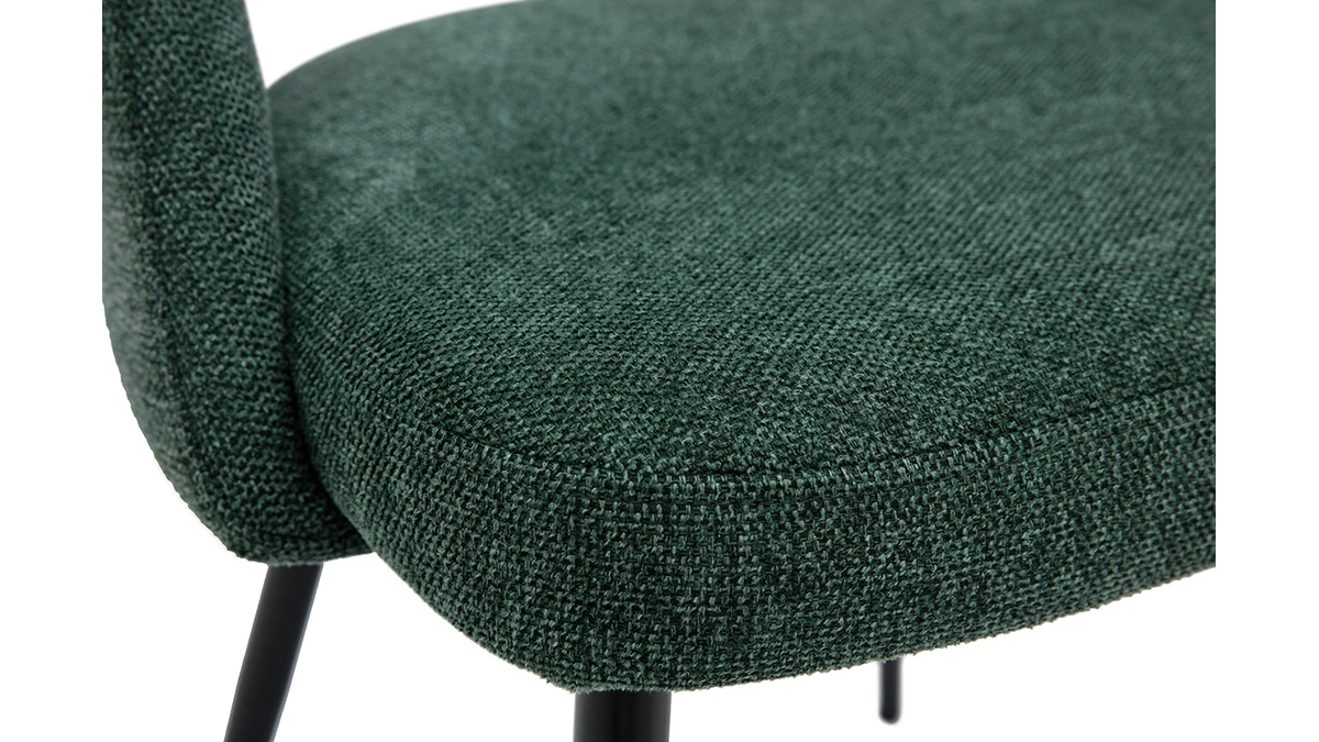 Ces assises au charme subtilement rétro sont synonymes de convivialité et de partage. Leur tissu effet velours texturé (100% polyester) se décline dans un coloris vert élégant et intemporel. Les pieds fuselés en métal noir apportent de la légèreté à la silhouette et s’accordent aisément avec tous les styles de tables à manger.