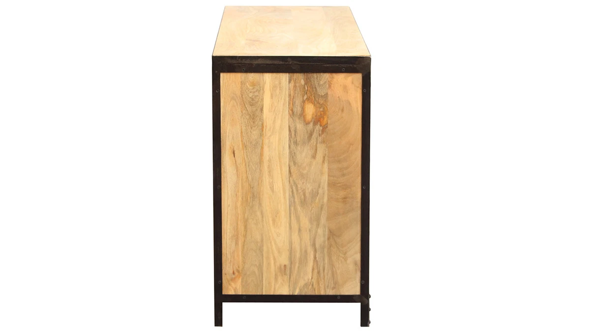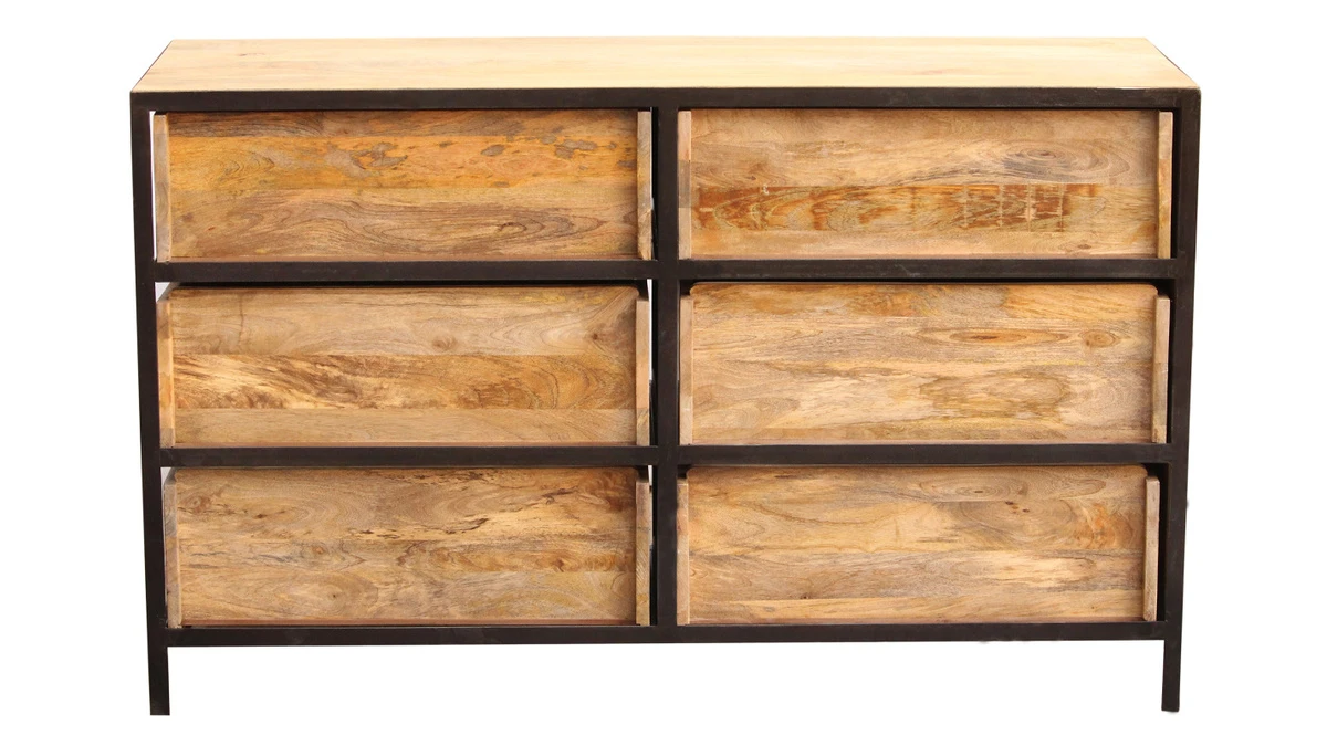 L’alliance de l’acier brut, du métal noir et du manguier massif, le contraste des matières et des couleurs confèrent à ce modèle un style unique qui en fait déjà un futur classique. Le look vintage industriel de cette commode en bois et métal noir est obtenu grâce à une conception spécifique : sa patine, ses marques d’usures sont travaillées et résultent d’un ponçage et de soudures artisanales. Le manguier est une essence de bois exotique dense, durable, très résistante, qui ne nécessite pas d’entretien spécifique. D’excellente tenue, c’est le matériau idéal pour la confection de meubles de rangement.