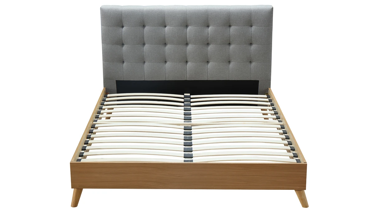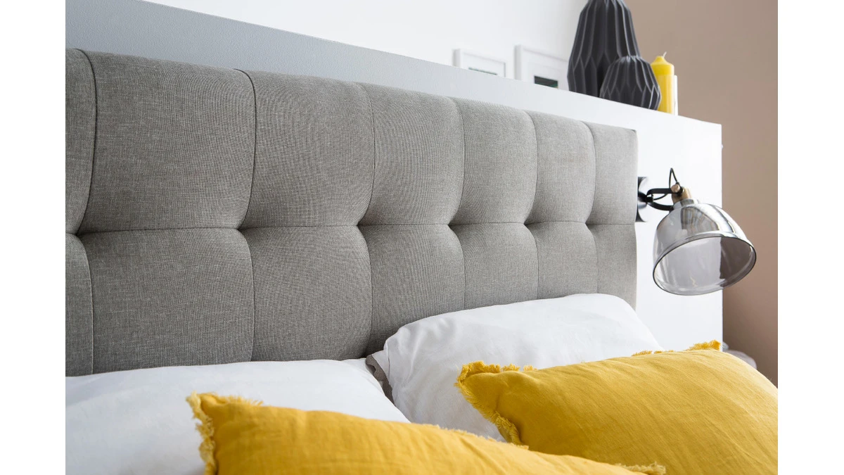 Cadre en bois et tête de lit capitonnée en tissu gris (revêtement 100% polyester) forment un tandem élégant et intemporel. On imagine ce lit 2 places camper dans une chambre d’adulte aux couleurs neutres, où il créera une ambiance cosy à souhait….