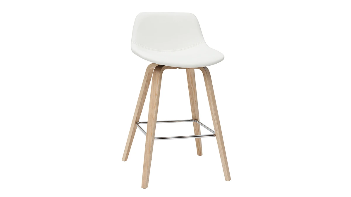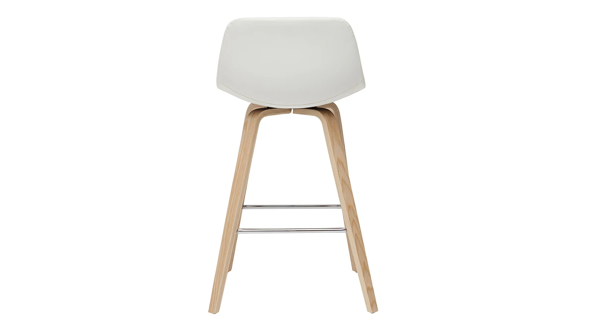 L’assise et le dossier haut sont rembourrés (densité de la mousse 24 kg/m3) et recouverts d’un joli revêtement en polyuréthane blanc. Les pieds inclinés bois clair et le repose-pied de hauteur standard participent également au confort.