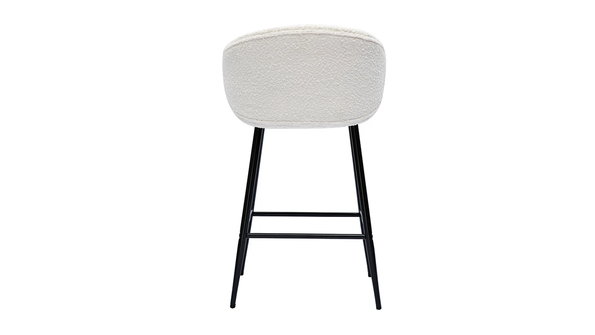 Les tabourets de bar ROSALIE sont recouverts d’un tissu effet laine bouclée (100% polyester) doux au toucher. L’élégant passepoil qui dessine les contours du dossier parfait l’ensemble.