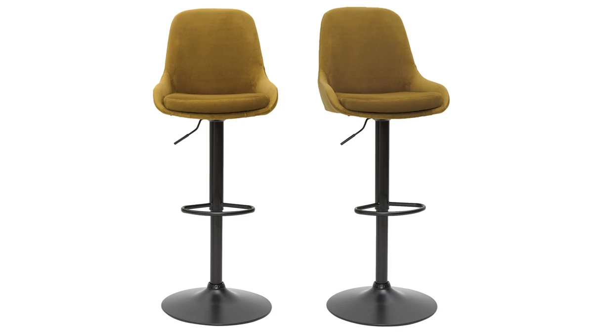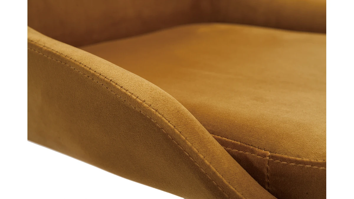 En plus d’être parfaitement fonctionnels, les tabourets de bar HOLO offrent un vrai confort d’assise grâce à leur coque enveloppante. L’assise et le dossier sont rembourrés (densité mousse 24 kg/m3) et entièrement recouverts d’un magnifique tissu velours bronze (100% polyester) ultra doux au toucher. Le dossier haut (H38 cm) et le repose-pied intégré renforcent un peu plus l’idée de confort.