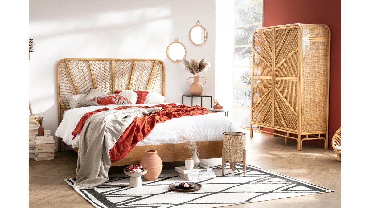 Le motif, inspiré par les nervures des feuilles, trouvera sa place dans une chambre à la décoration naturelle. On aménage son espace nuit avec des matériaux bruts pour un style exotique. La structure en rotin a été travaillée de façon artisanale offrant un rendu authentique plein de charme.